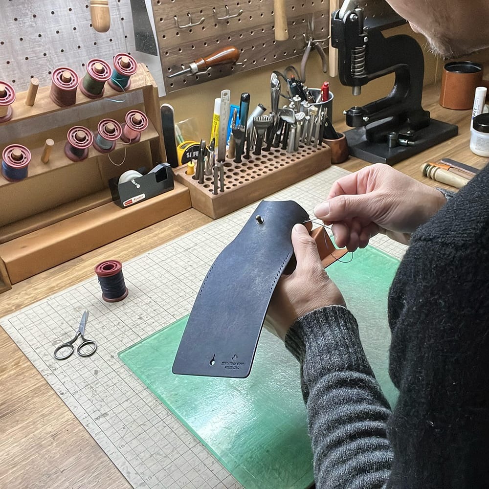 革を切って、穴あけて、そして縫う。