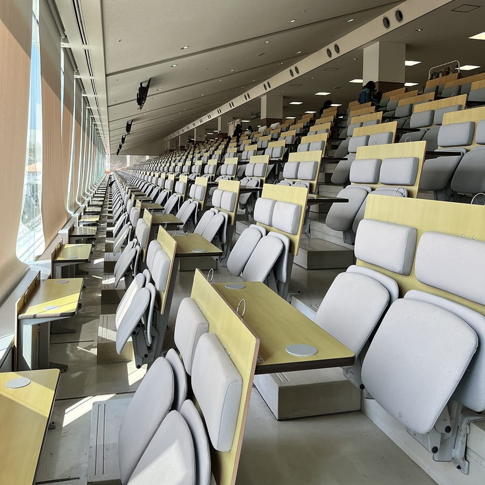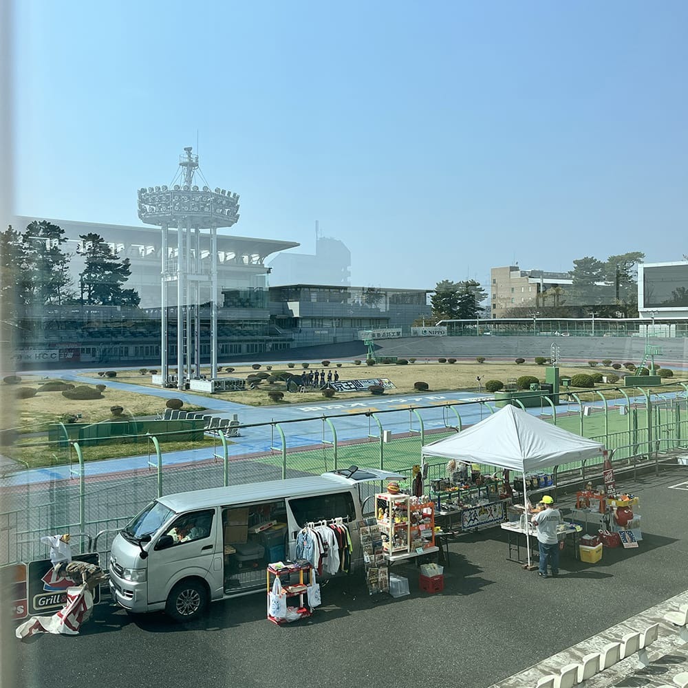 自分のブースの後ろからコースが見えて、競輪選手が練習している姿も見える。